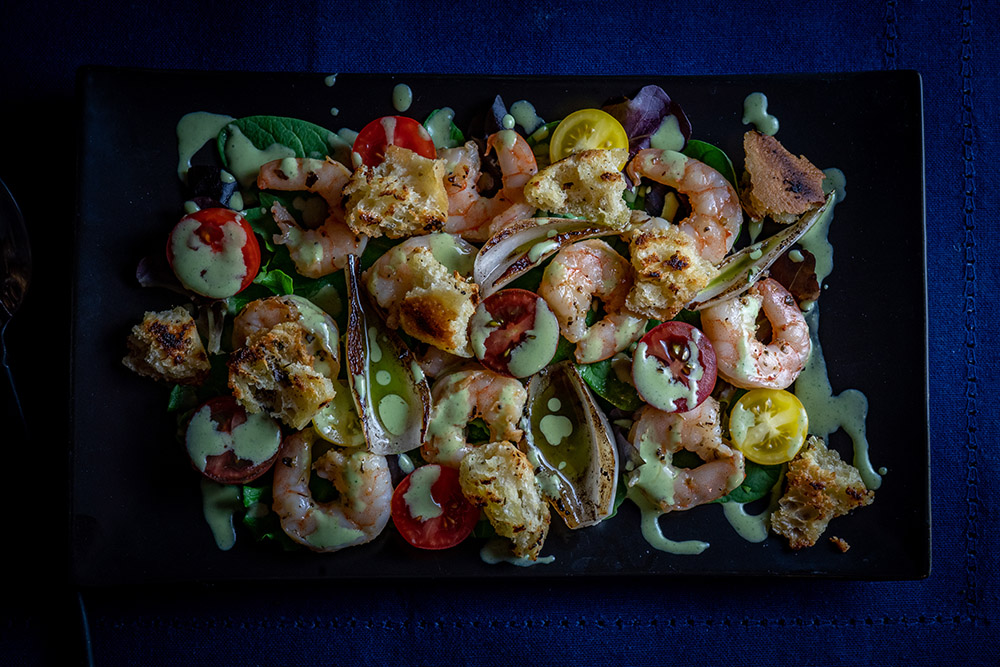 <<<<< previous blog next blog >>>>>Prawn salad with charred sweet onions, garlic croutons, and green goddess dressing.
