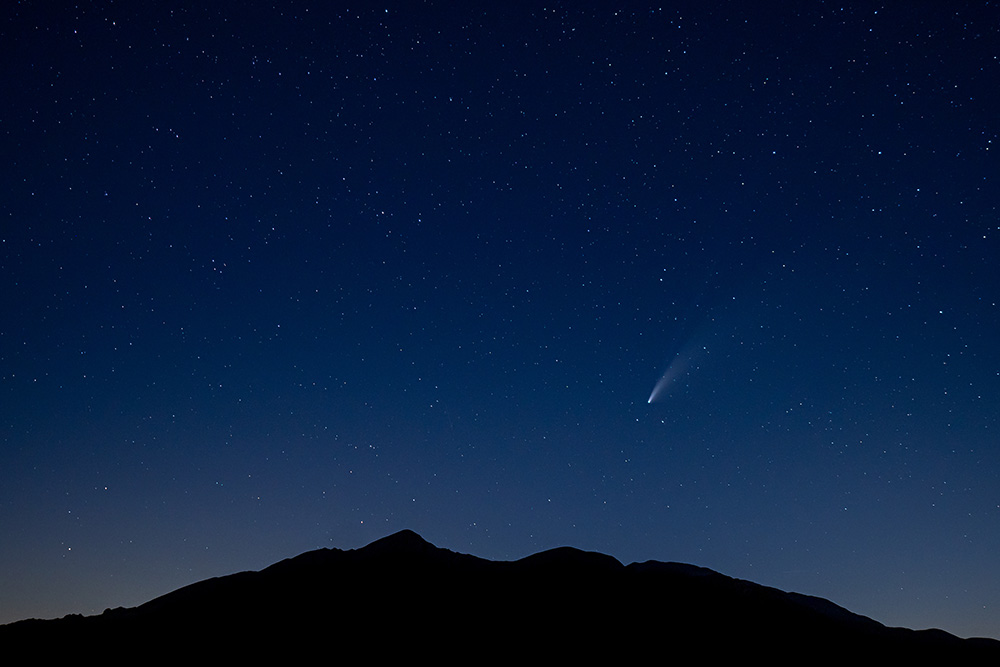 I took lots of photos of the comet. The general strategy is to find something interesting to silhouette against it since it's kind of boring all by itself. But in the end I think I like this stark simple composition better. Just a wandering ball of ice in the vastness of space. Here for a short time, then perhaps never to be seen by mankind ever again. Hard to imagine hairless apes making it until the year 8786.
